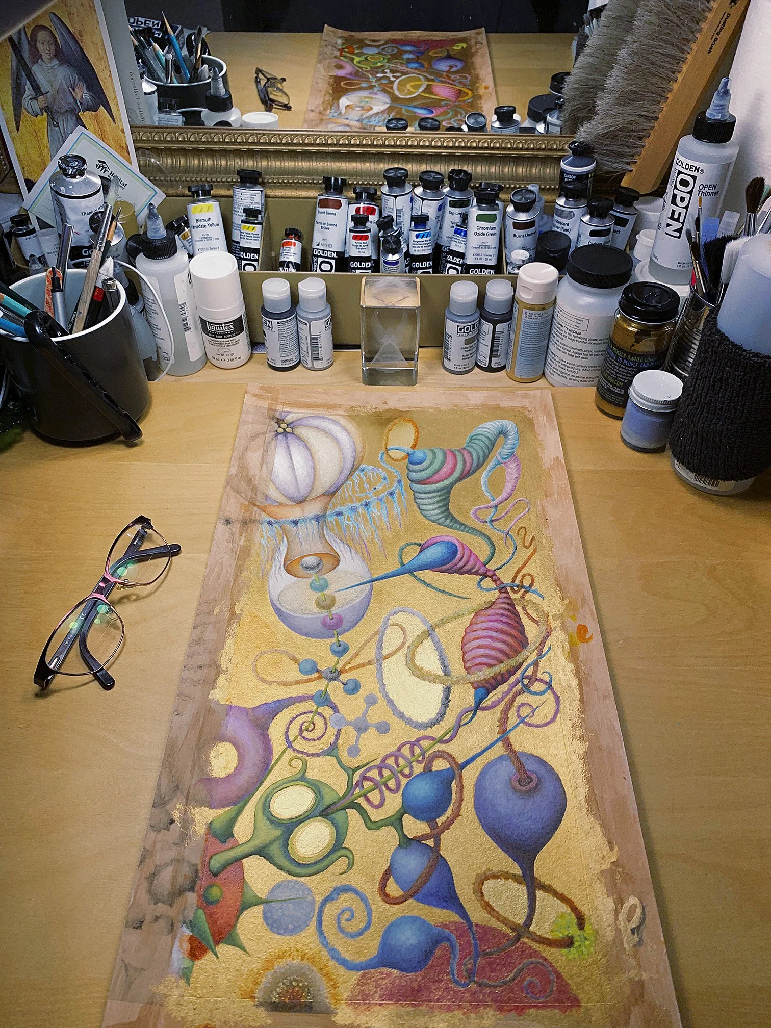 SPECTRAL ILLUMINARE: acrylic over archival pigment print, 2022, 8.5 x 6” on 11 x 8.5” paper. Collection of Mediumistic Art, Munich, Germany. Courtesy of Dr. Elmar R. Gruber