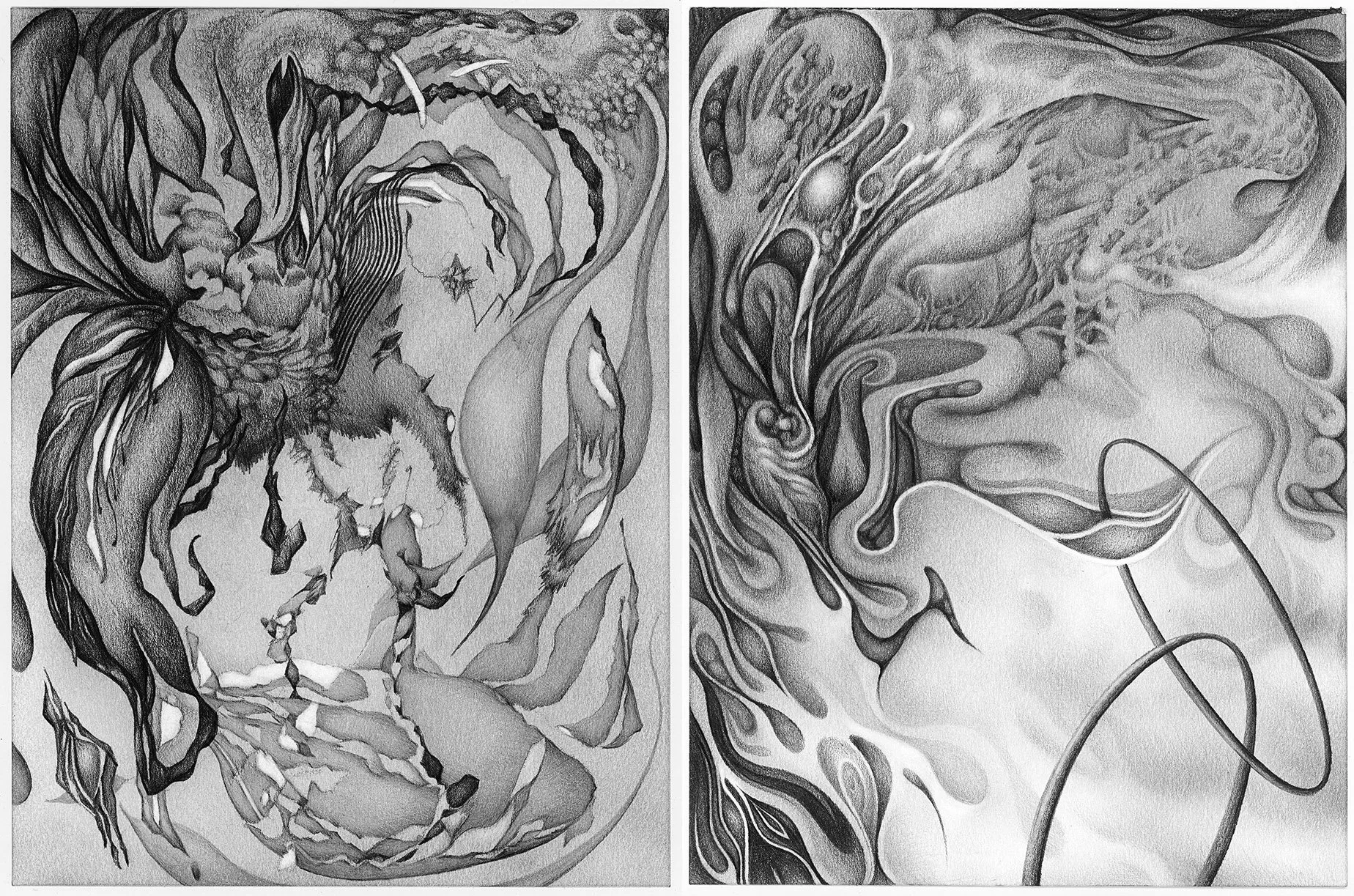 AETHERSCAPES, Left: #4-WINDFALL; Right: #1-LINK, Graphite on Rag Paper, 8 x 6” each, 2023. Courtesy of the Artist.